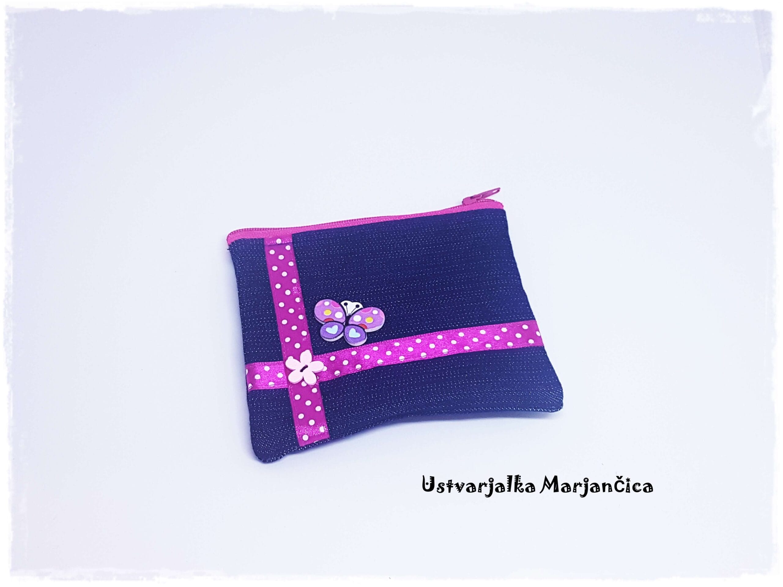 Material: temno moder jeans, okrasni trak, leseni gumb v obliki metuljčka in rožice, črna podloga