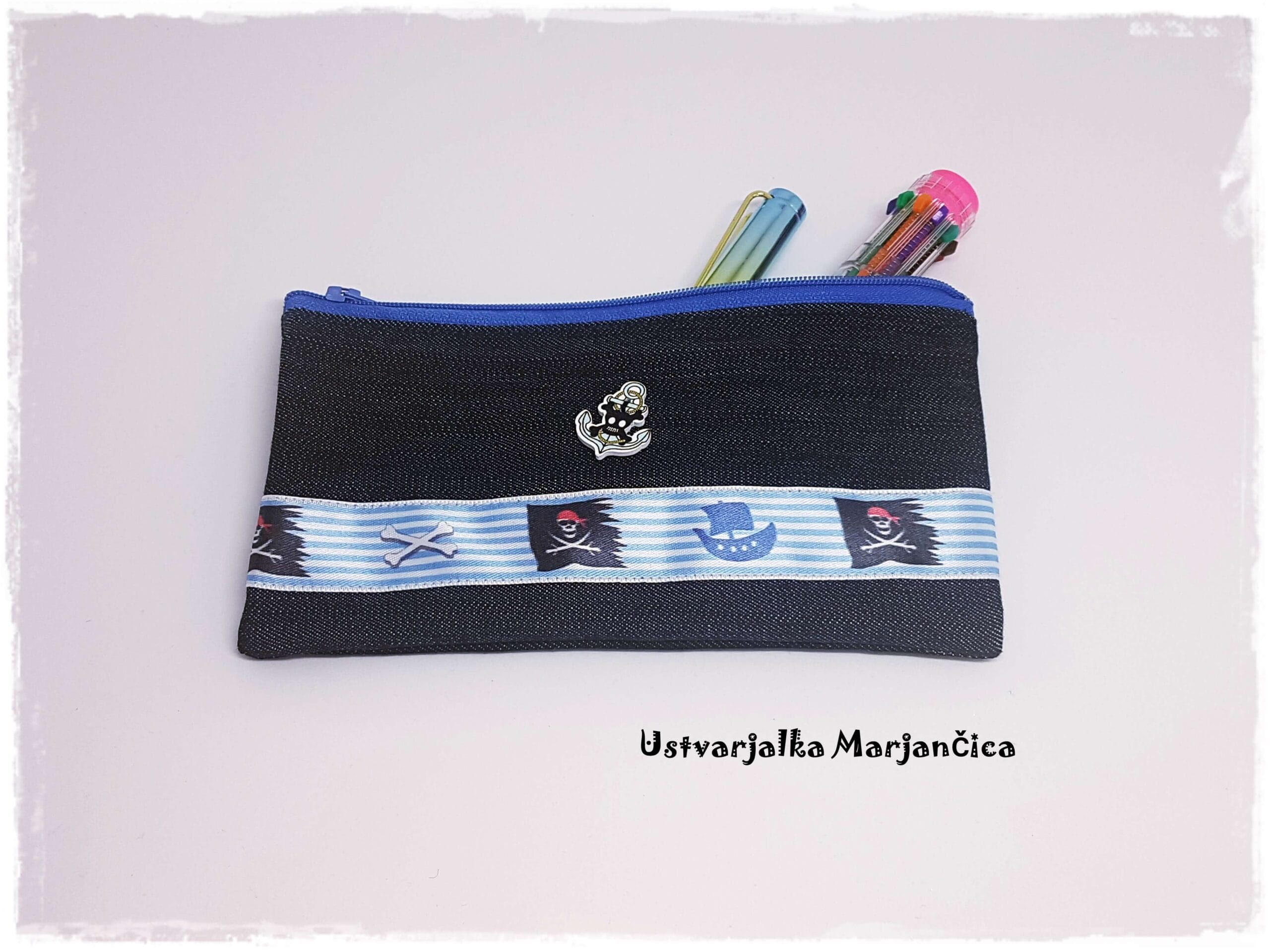 Material: temno moder jeans, okrasni trak z motivom gusarjev, okrasni leseni gumbi v obliki sidra, črna podloga