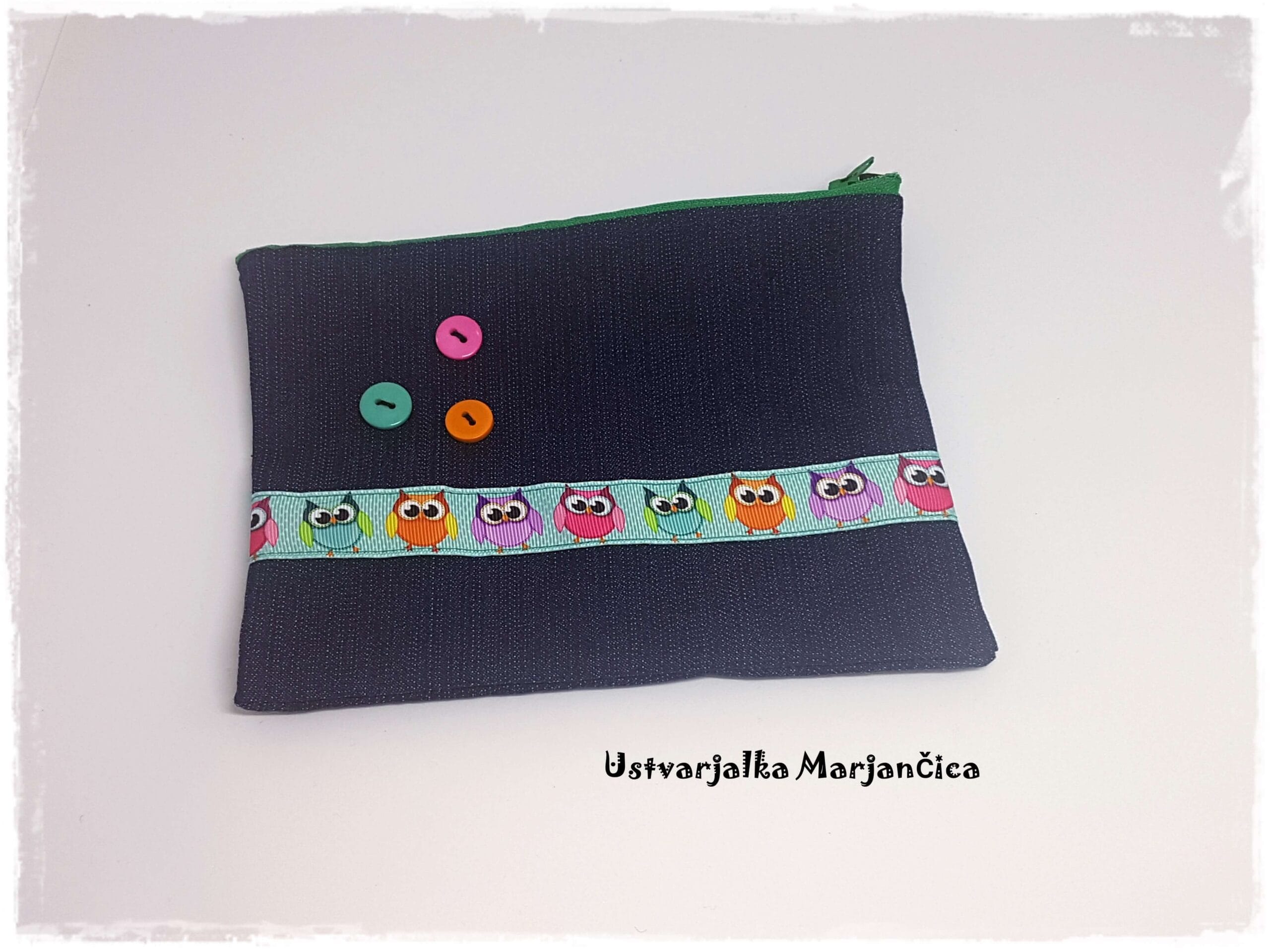 Material: temno moder jeans, okrasni trak s sovicami, okrasni gumbi, črna podloga