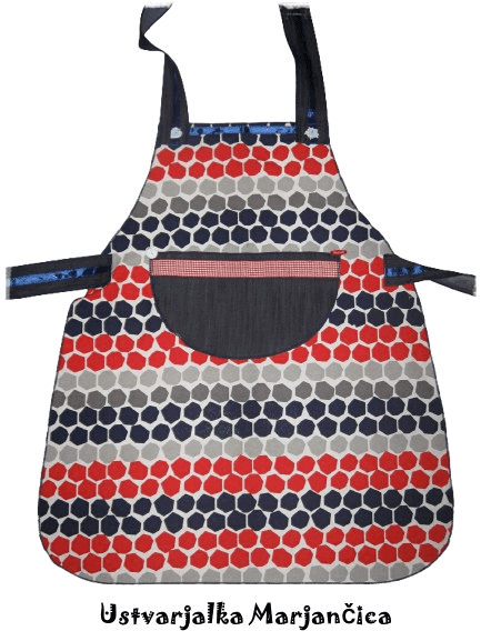Predpasnik sivo-modro-rdeč in moder žep je izdelan iz prijetnega materiala in okrašen s saten trakovi in okrasnimi gumbki. V vzorcu se prepletajo bela, siva, modra in rdeča barva in je tako primeren za ženske in moške.