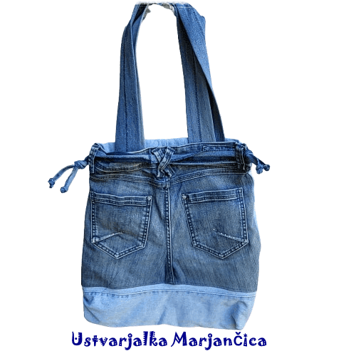 Torba recikliranka z vrvico je izdelana iz recikliranega jeansa v več modrih odtenkih. Ima unikatno obliko. Je podložena, ima notranje žepe (1x z zadrgo, 1x brez zadrge) in se zapira z vrvicama. Vrvici sta izdelani iz jeansa. Na zunanji strani ima še dva žepa.