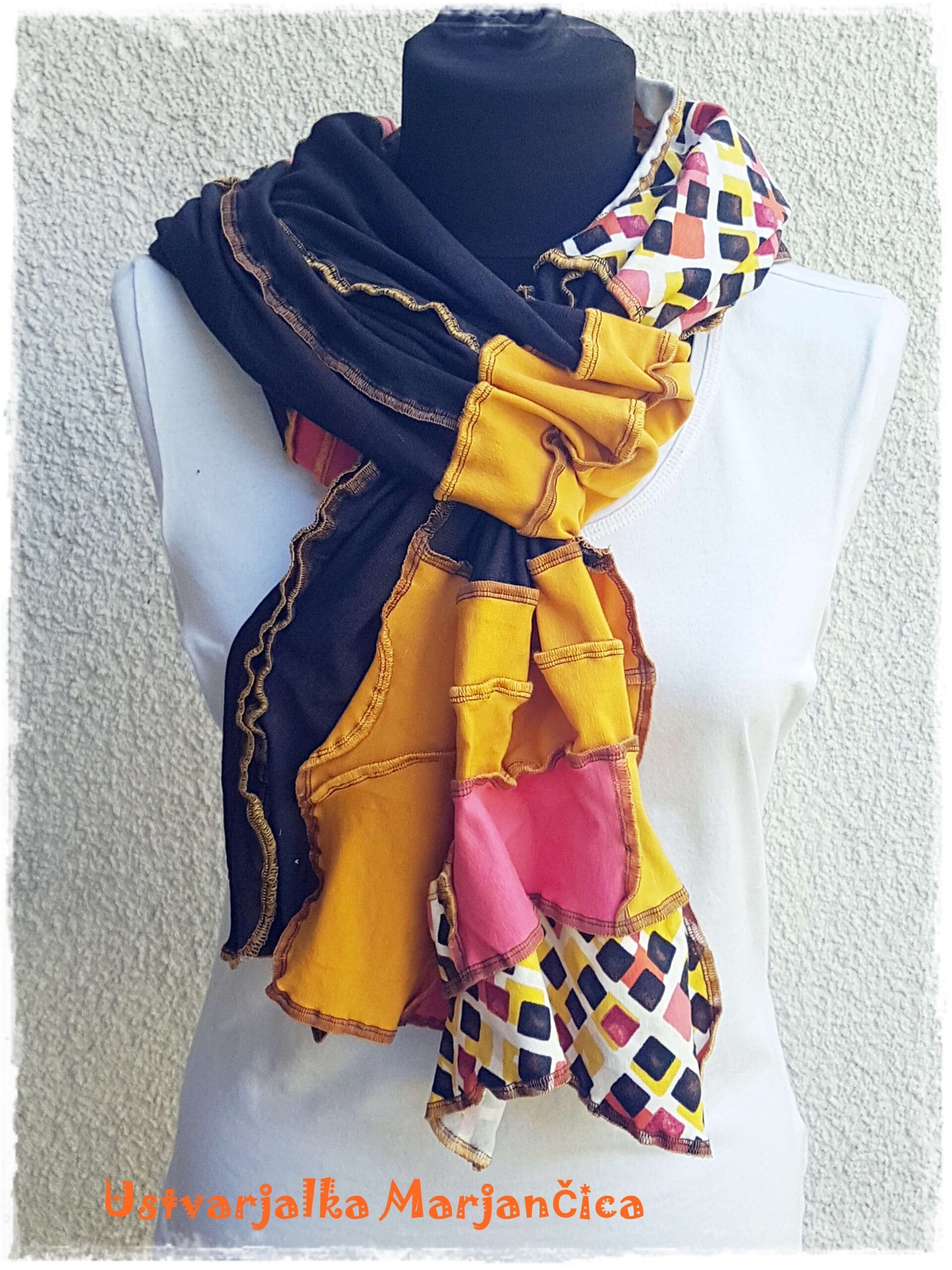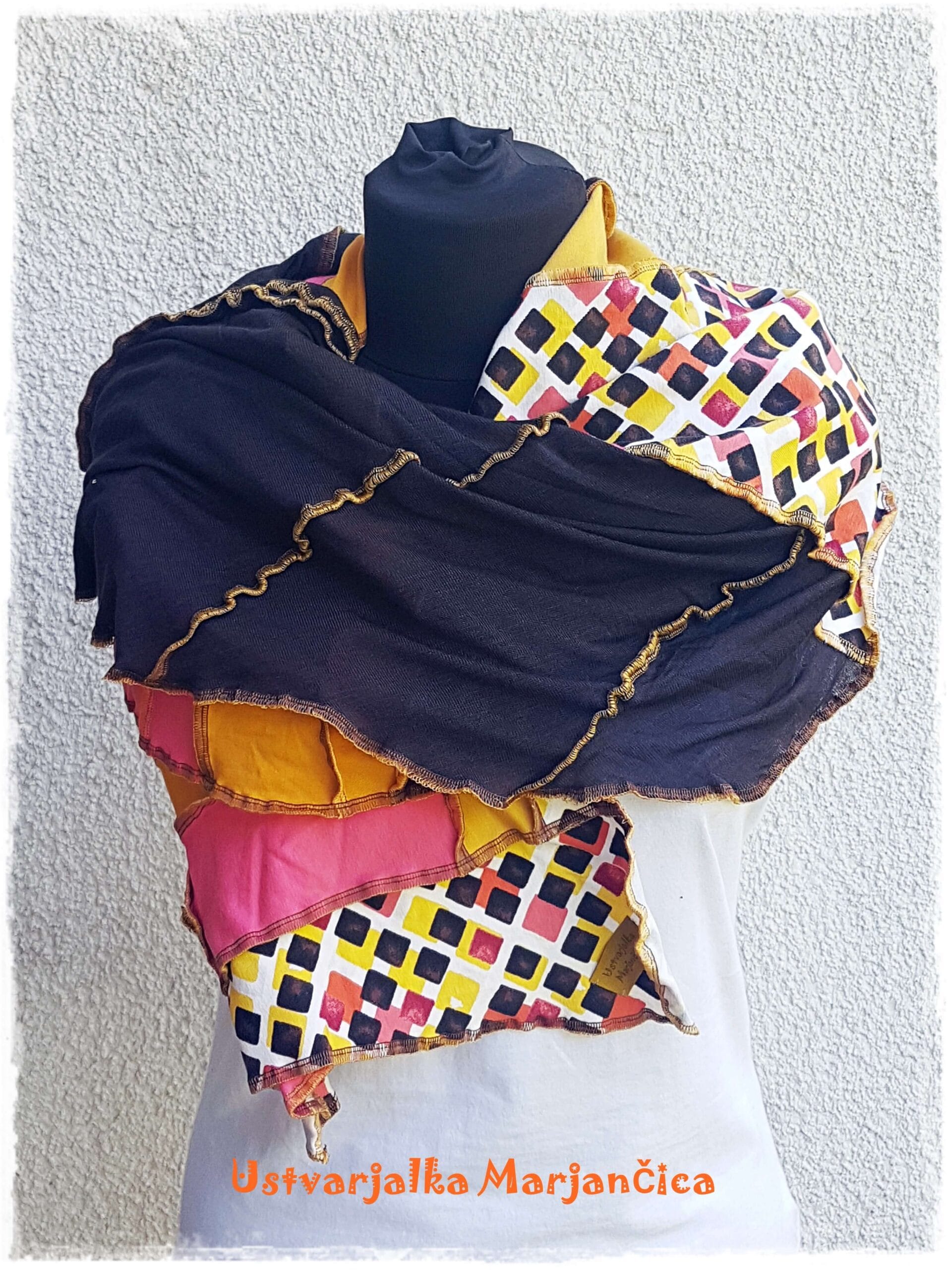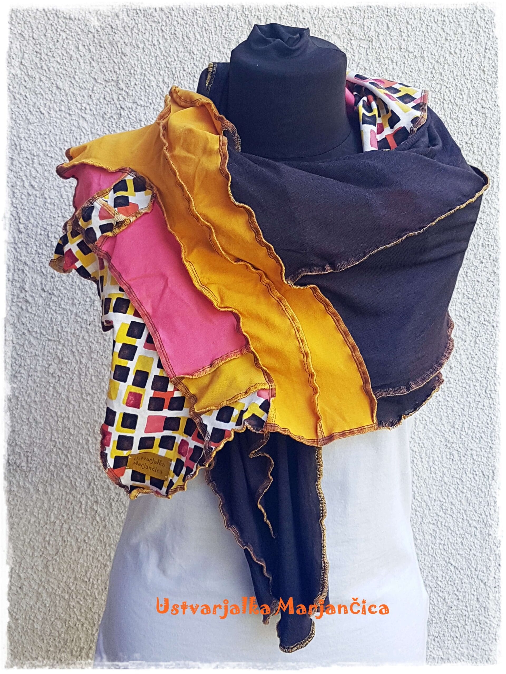 Unikaten oranžno – rjav pisan šal je izdelan iz raztegljivih materialov, ki omogočajo čudovite valovite okrasne oker šive. V šalu se prepletajo različne barve (umazano rumena, čokoladno rjava, marelična) in vzorec kvadratkov v že naštetih barvah.