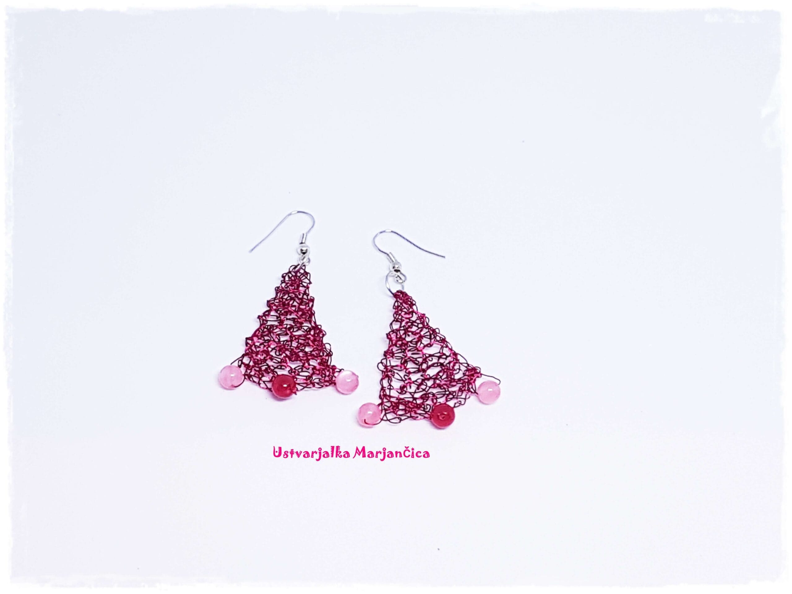 Unikatni kvačkani uhani iz žice pink so sestavljeni iz kvačkane pink-roza osnove na katero so dodane 5 mm velike akrilne perlice. Perlice so pink in roza barve, rahlo bleščeče. Uhani so zanimive trikotne oblike in dolgi cca. 4 cm.